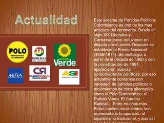 Web Qué partidos politicos existen. É um dos dois partidos políticos tradicionais da Colômbia. Web La Cámara de Representantes posee 166 miembros y el Senado 100.
